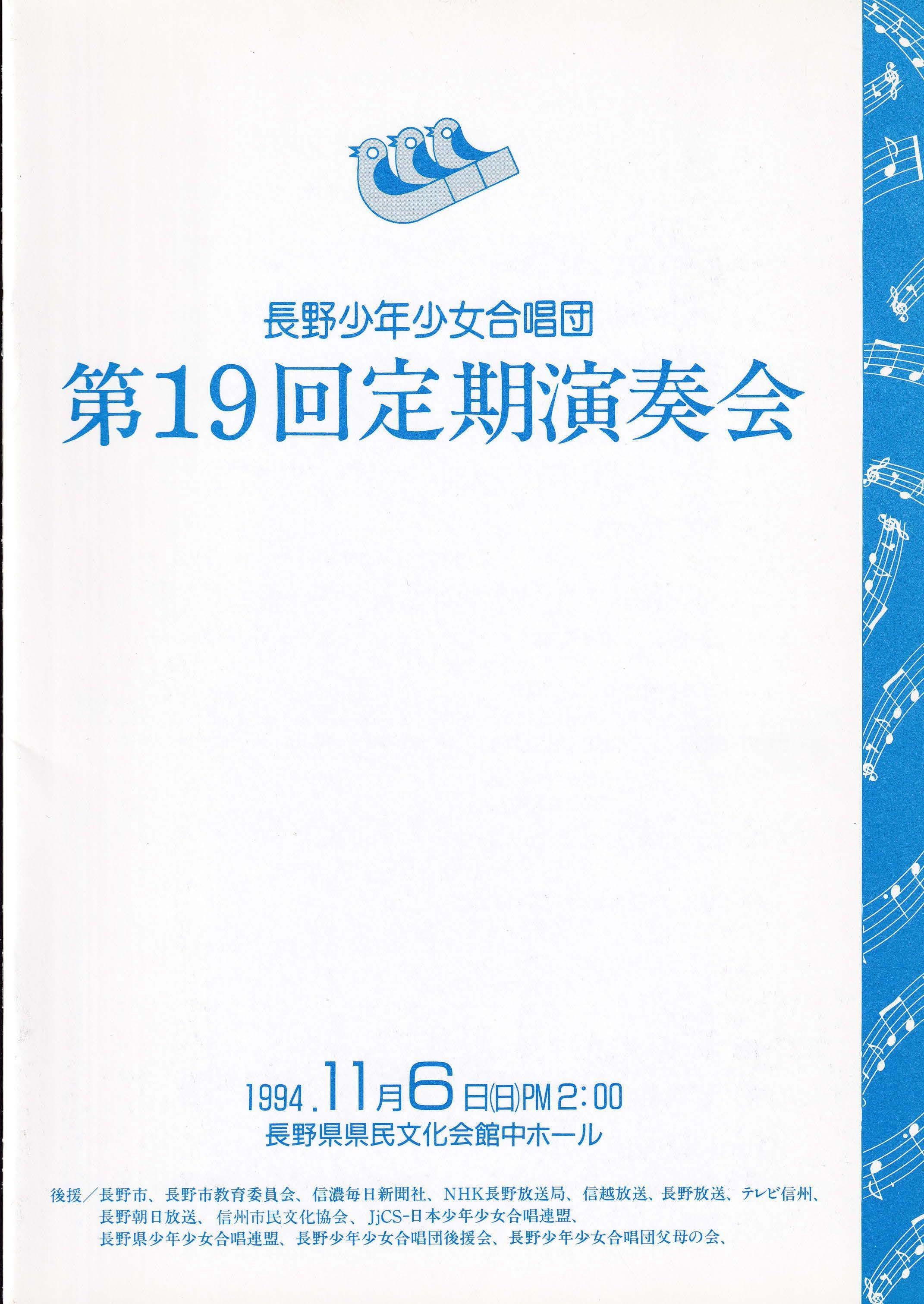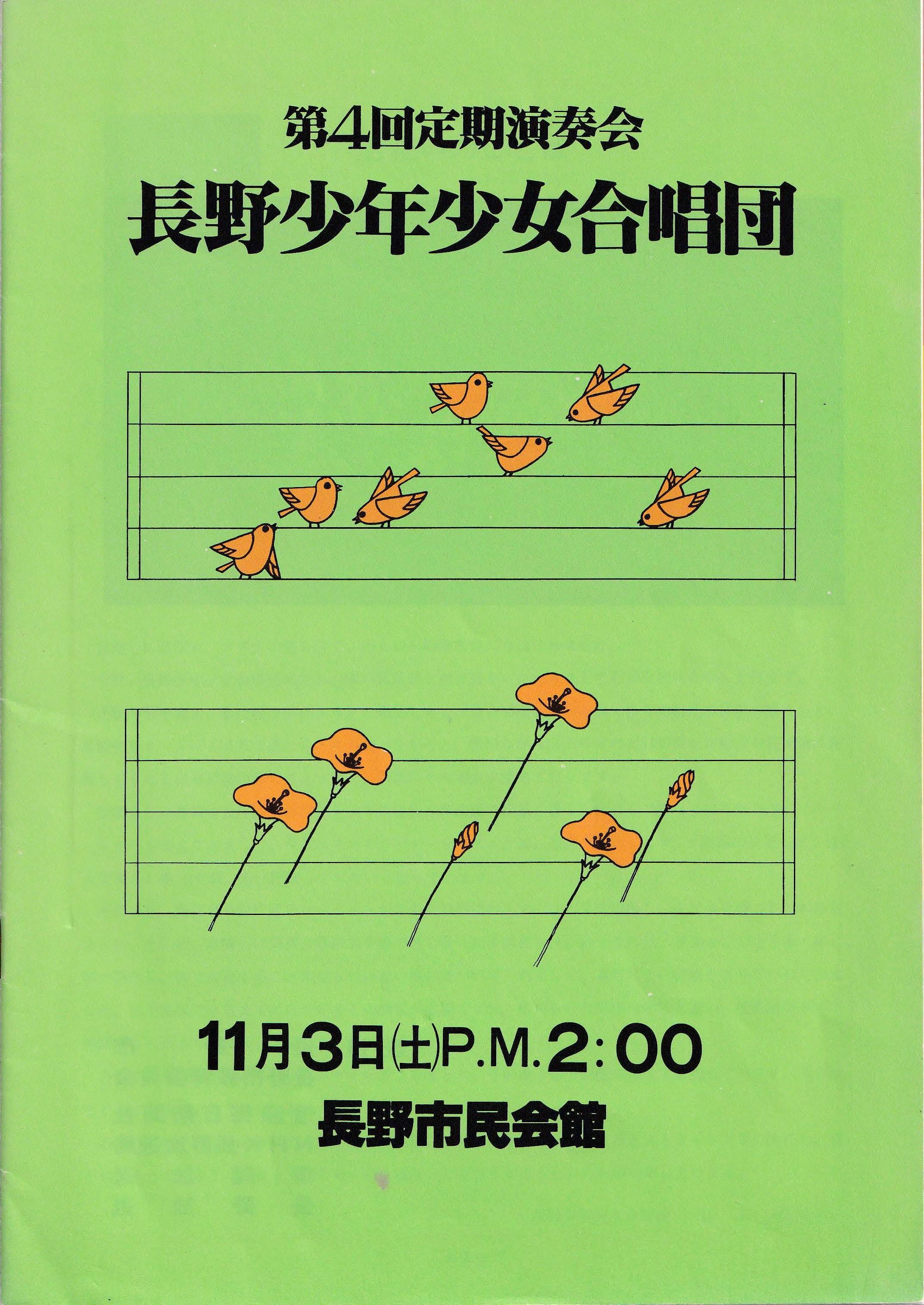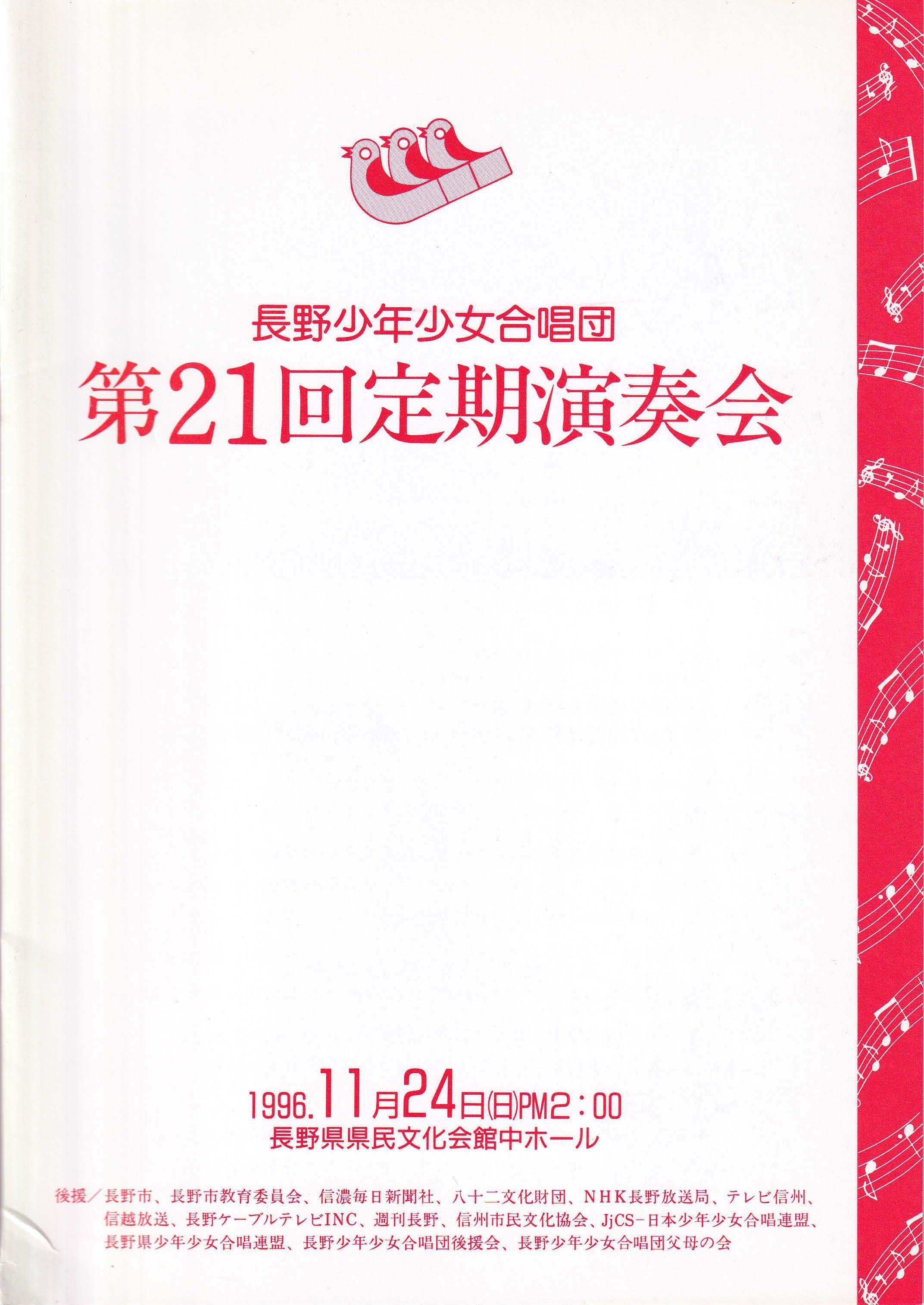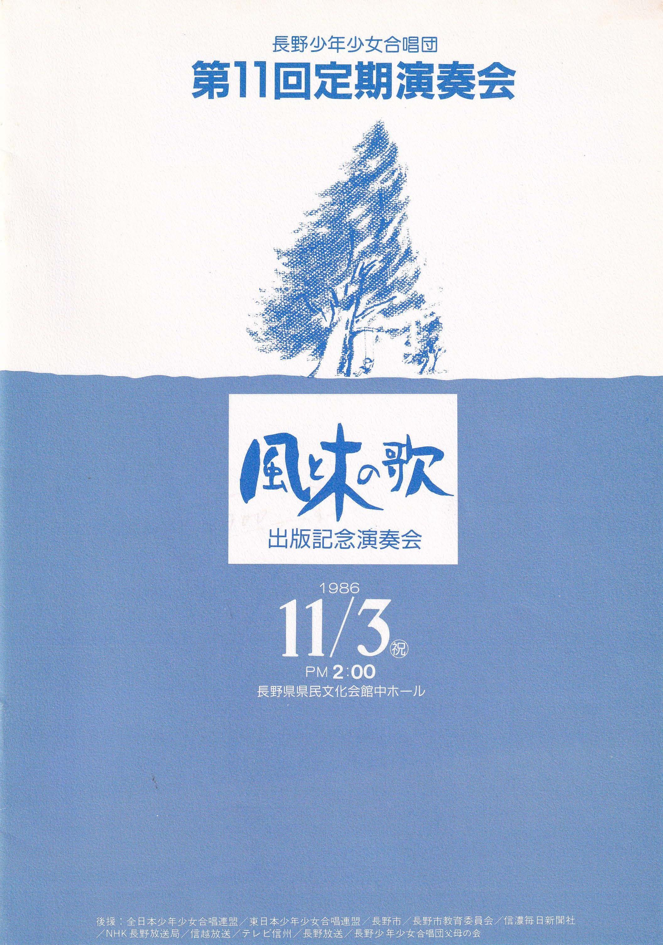 合唱組曲「風と木の歌」より長野少年少女合唱団創立10周年記念委嘱作品 Ⅱ花かぞえうた Ⅲ風と木の歌3. 大作曲家の名曲 Ave verum corpus G.フォーレ/Ave verum corpus C.サン=サンーンス/Ave verum corpus W.バード/Ave verum corpus W.A.モーツァルト/4. 名曲の花束~おうちにかえろう/道はともだち/ヘイ!タンブリン/こもりうた/地球の仲間/とねりこの森(イングランド民謡)/懐かしき愛の歌(アイルランド民謡)/イマジン/ヘイ・ジュ―ド5. リトミック遊び~お客様といっしょに~