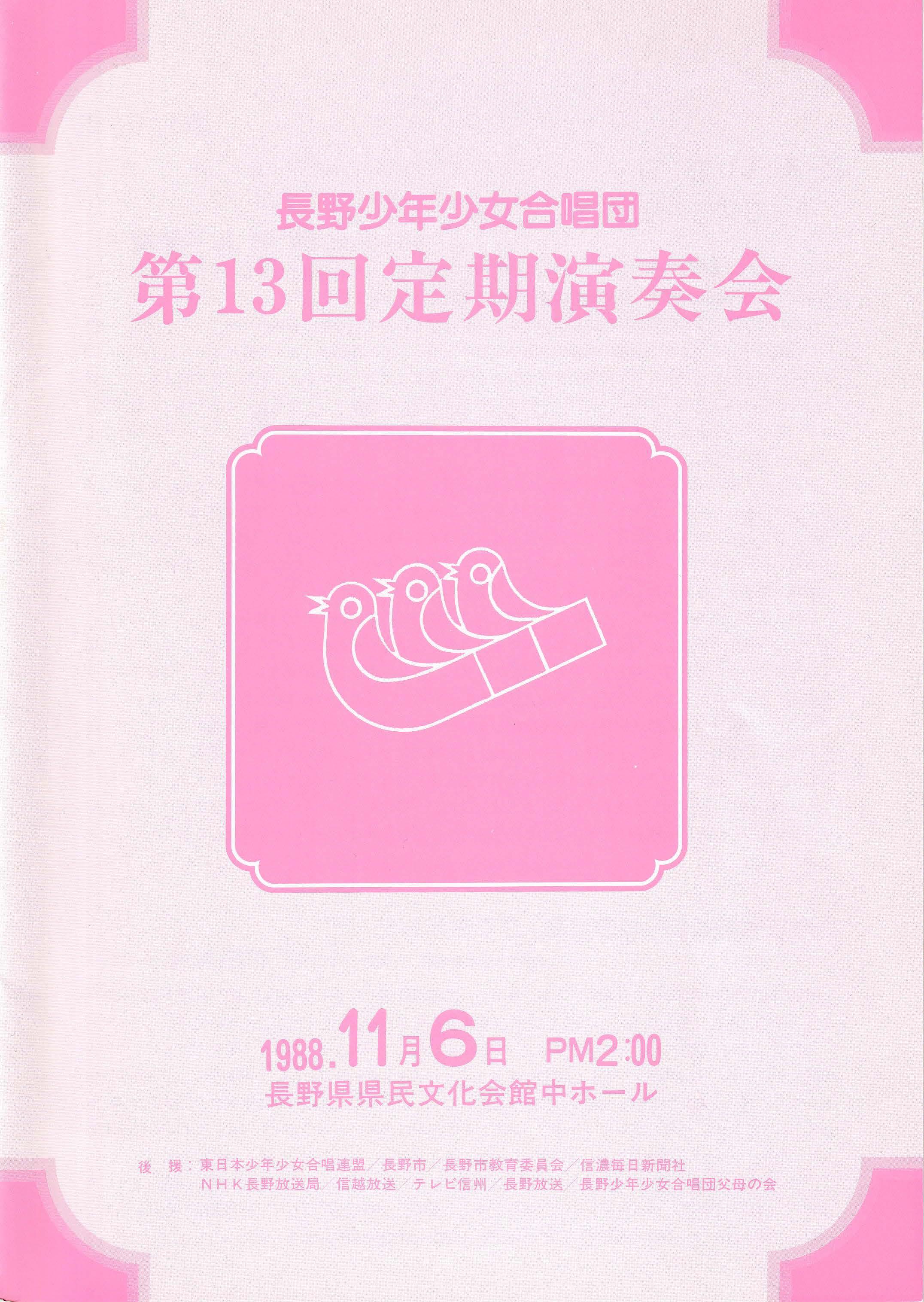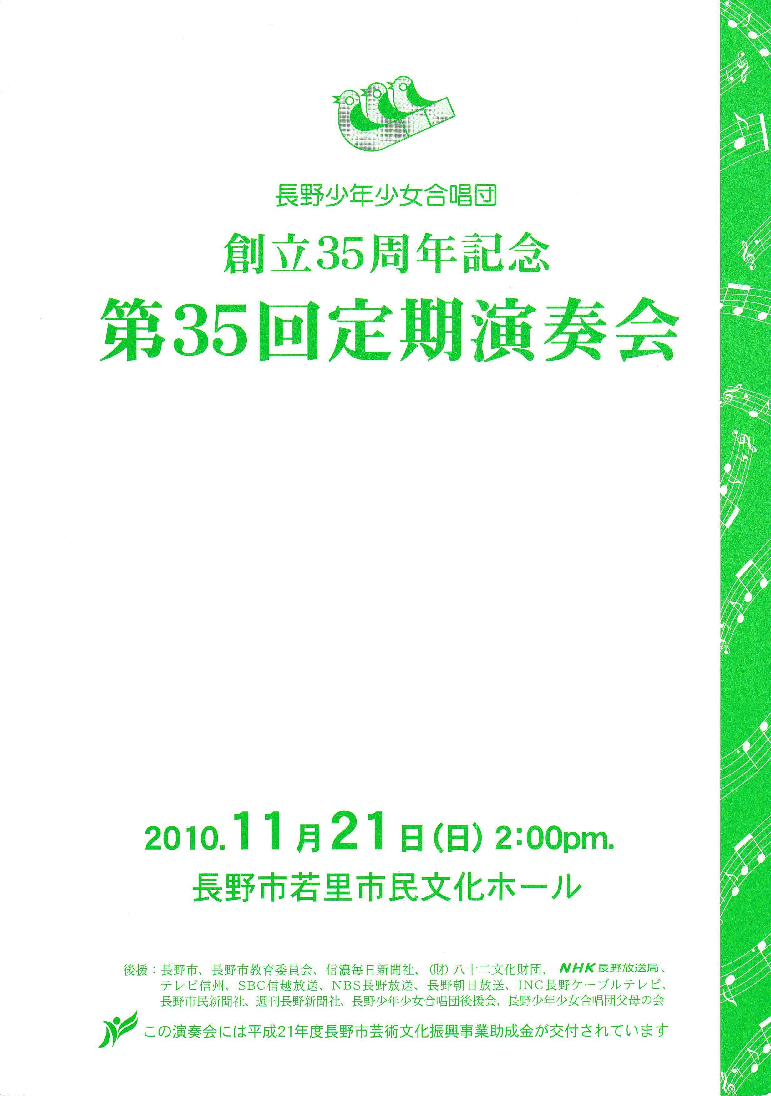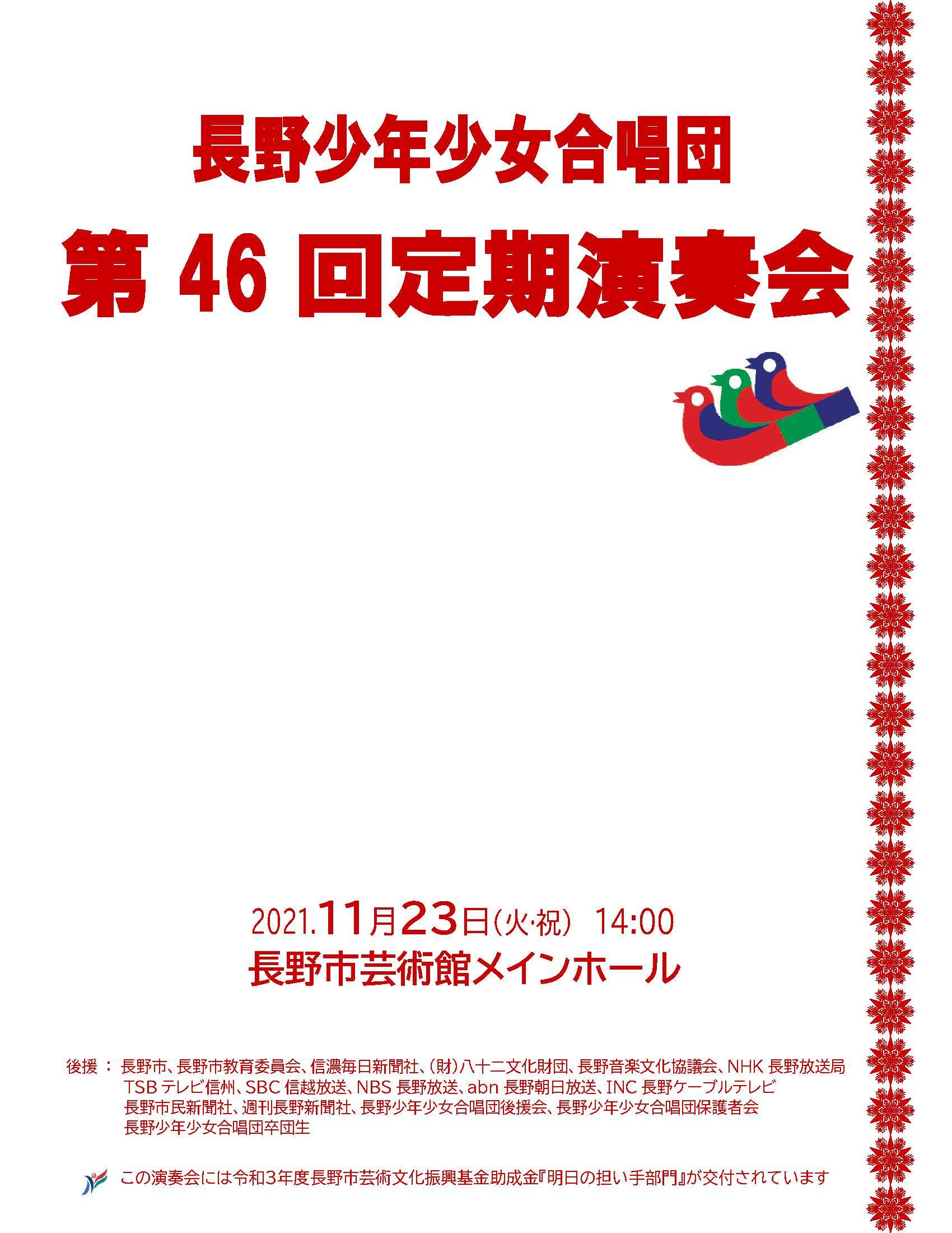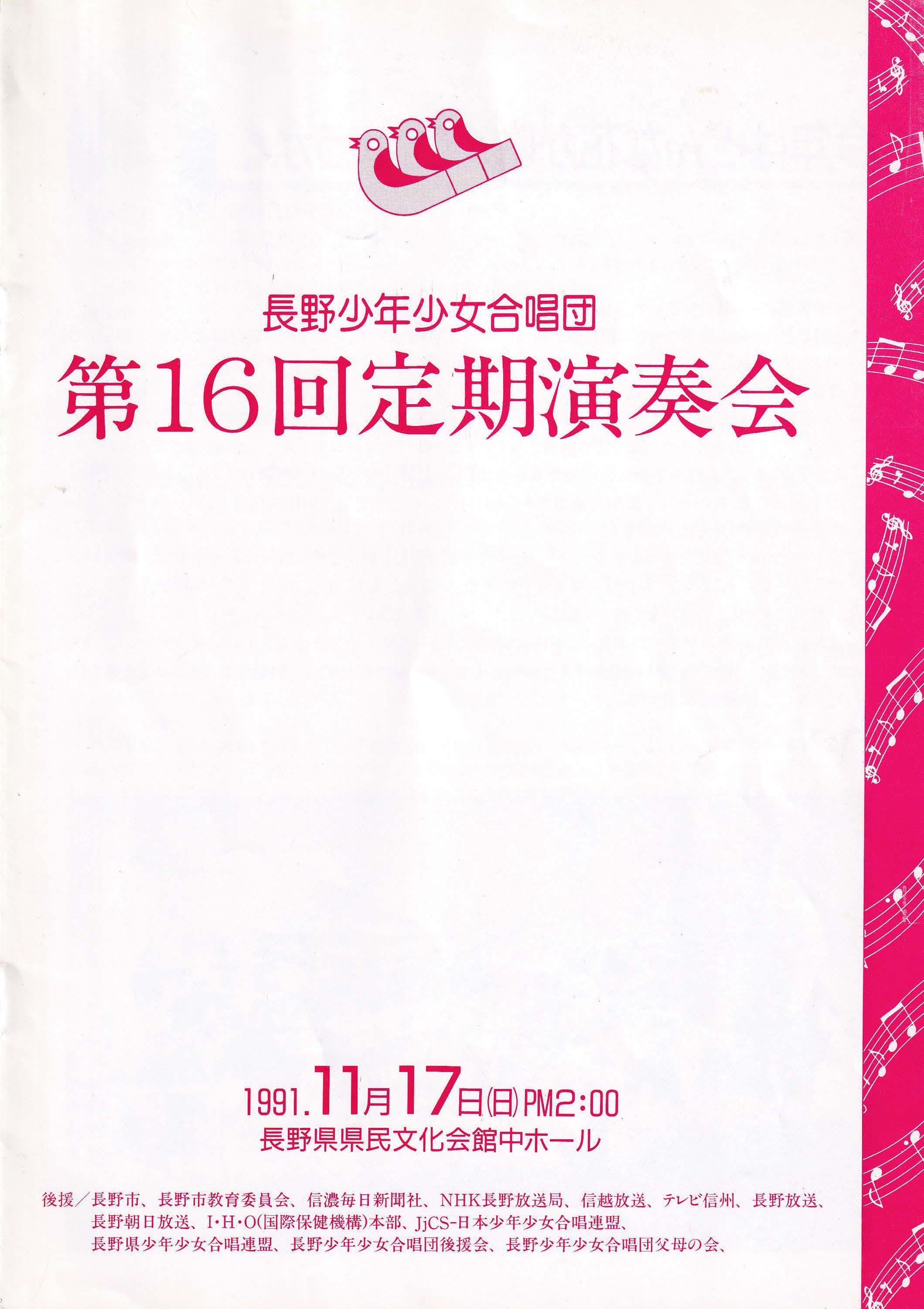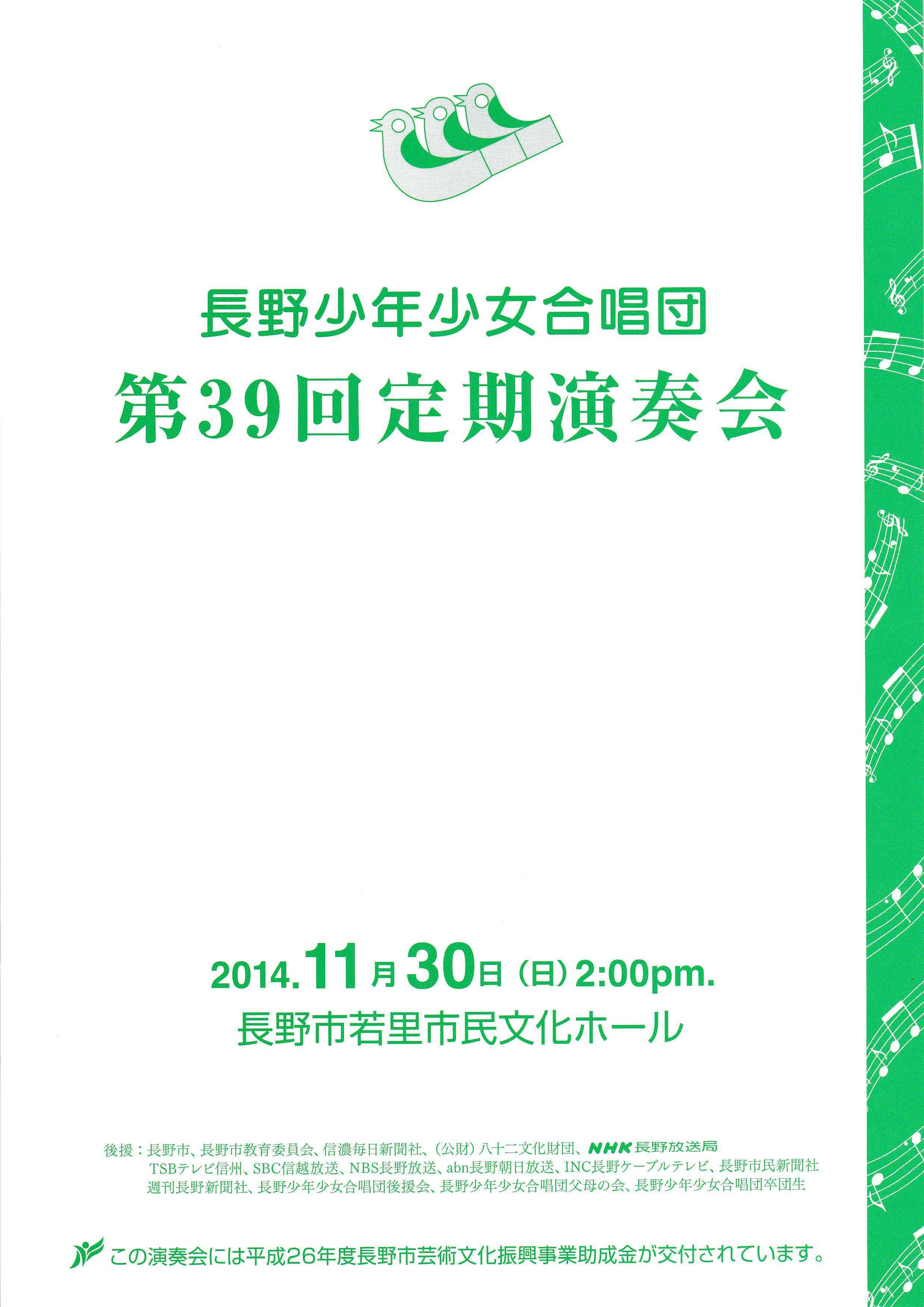 合唱組曲「風と木の歌」より長野少年少女合唱団創立10周年記念委嘱作品 Ⅱ花かぞえうた Ⅲ風と木の歌3. 大作曲家の名曲 Ave verum corpus G.フォーレ/Ave verum corpus C.サン=サンーンス/Ave verum corpus W.バード/Ave verum corpus W.A.モーツァルト/4. 名曲の花束~おうちにかえろう/道はともだち/ヘイ!タンブリン/こもりうた/地球の仲間/とねりこの森(イングランド民謡)/懐かしき愛の歌(アイルランド民謡)/イマジン/ヘイ・ジュ―ド5. リトミック遊び~お客様といっしょに~